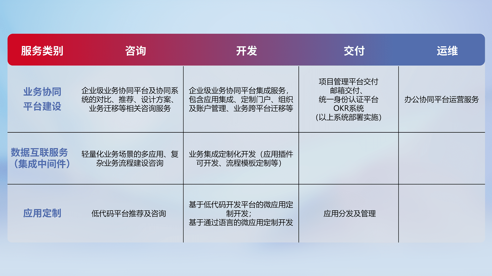 针对钉钉、、企微、、、IDaas等平台级产品提供产品的规划、、方案、、、、交付、、、、定制化开发等服务,,实现如统一协同办公、、智能客户服务、、、混合会议管理、、、智能数据查询、、等业务场景,,,实现数字化转型。。。